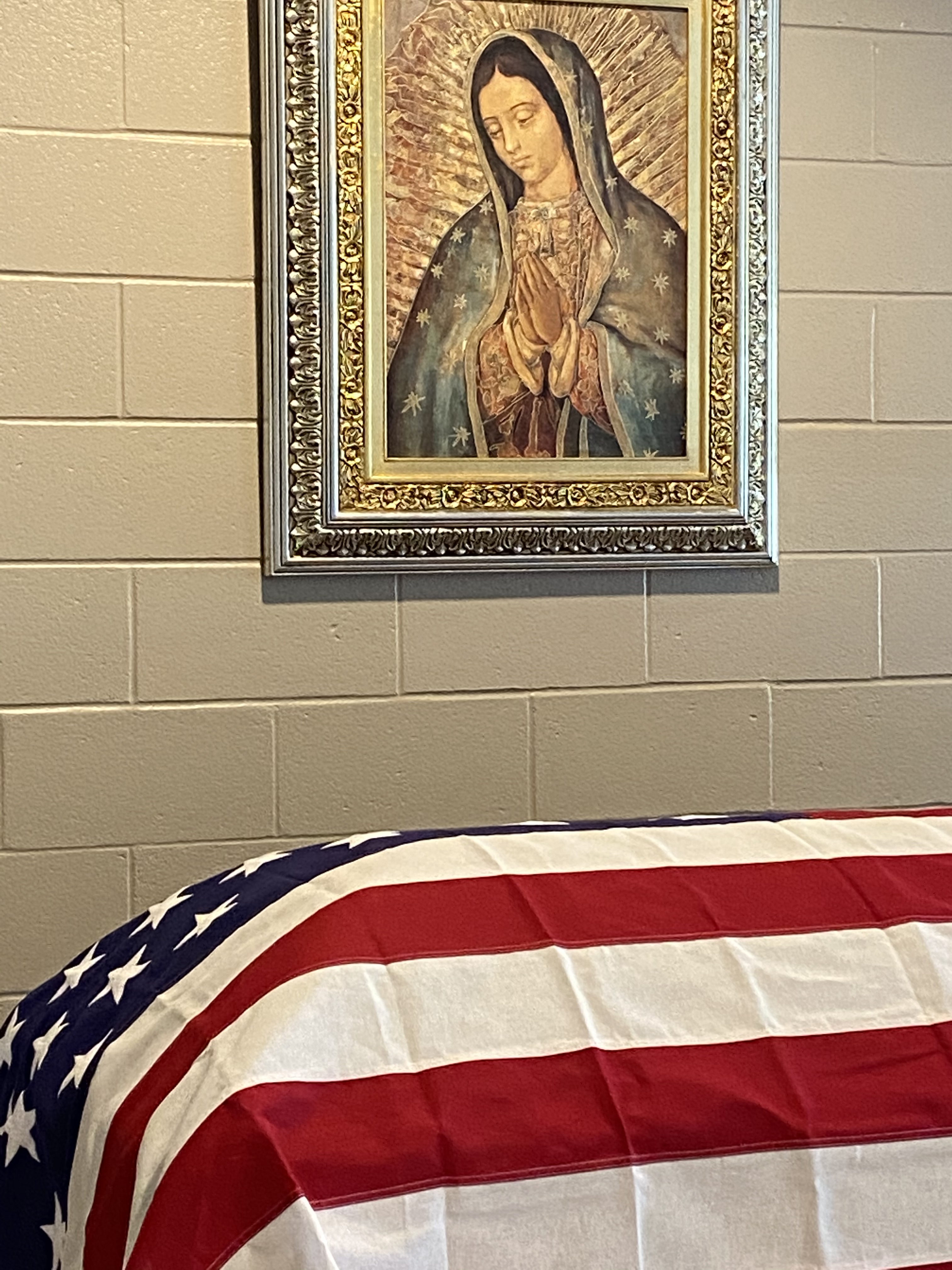Our Lady of Guadalupe, Patroness of the America’s looks down upon the American Flag draped coffin of World War II Fighter Pilot, William Edward Ferris, Jr.